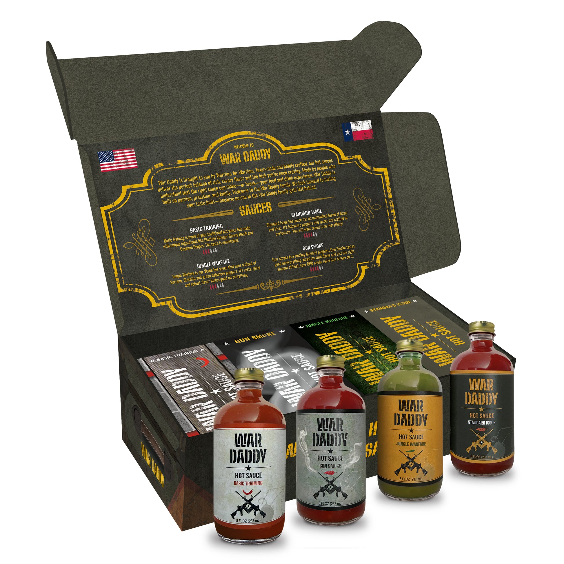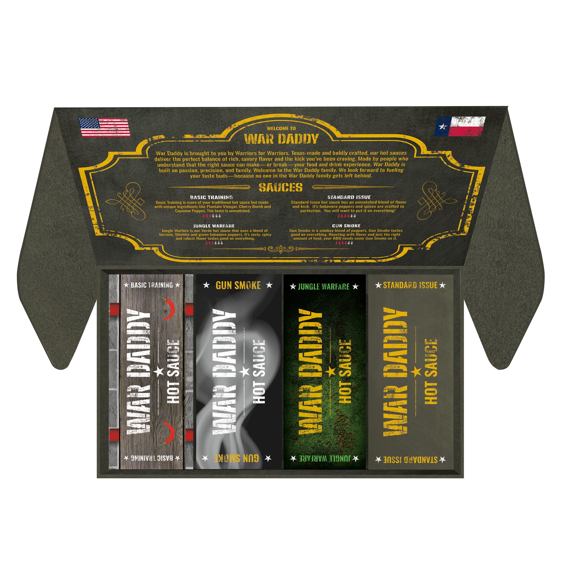 The War Daddy Foot Locker box comes with all four sauces with custom individual boxes, all in the War Daddy Foot Locker box.